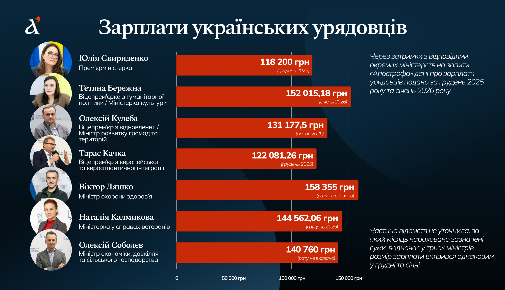 Важливо зазначити, що члени українського уряду не отримують премії, попри те, що за законом мають на них право. Деякі відомства просто не відповіли на запитання "Апострофа" про премії, деякі відповіли, що їхні очільники не отримували премії у січні 2026 року чи у грудні 2025 року (залежно від того, про зарплату за який місяць йшлося), а три відомства повідомили, що їхні очільники не отримували премії протягом усього 2025 року.