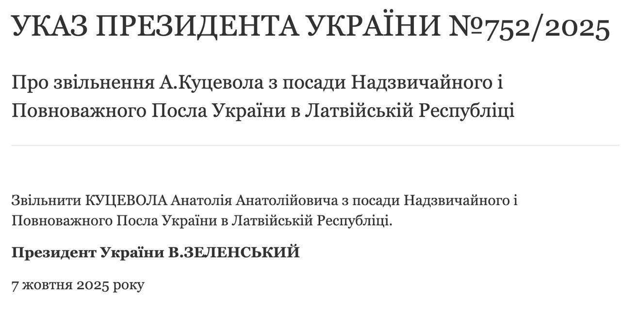 "Звільнити Куцевола Анатолія Анатолійовича з посади Надзвичайного і Повноважного посла України в Латвійській Республіці", – йдеться в указі.