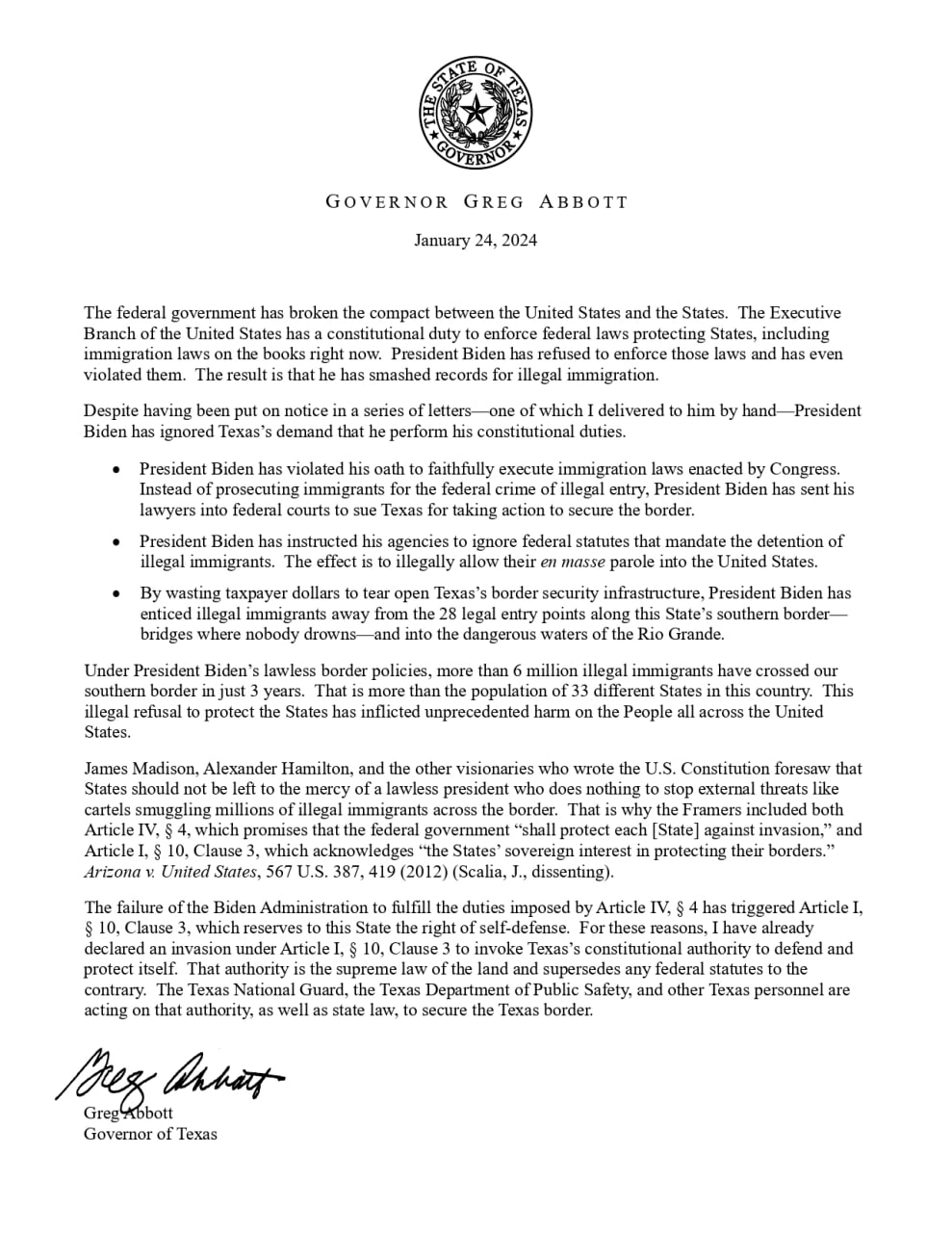 У листі він посилається на "конституційні повноваження Техасу захищати себе" від "вторгнення" мігрантів.