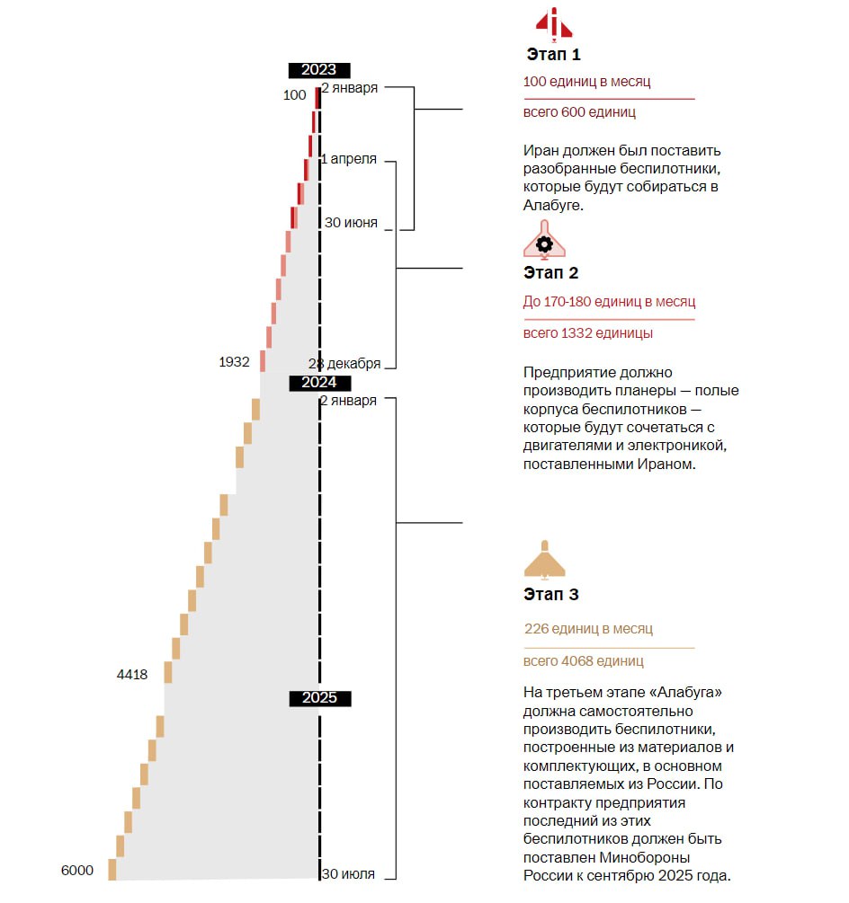 Крім того, у розслідуванні представлений графік виробництва дронів, розбитий на три етапи, з візуалізацією на основі витоку внутрішніх документів.