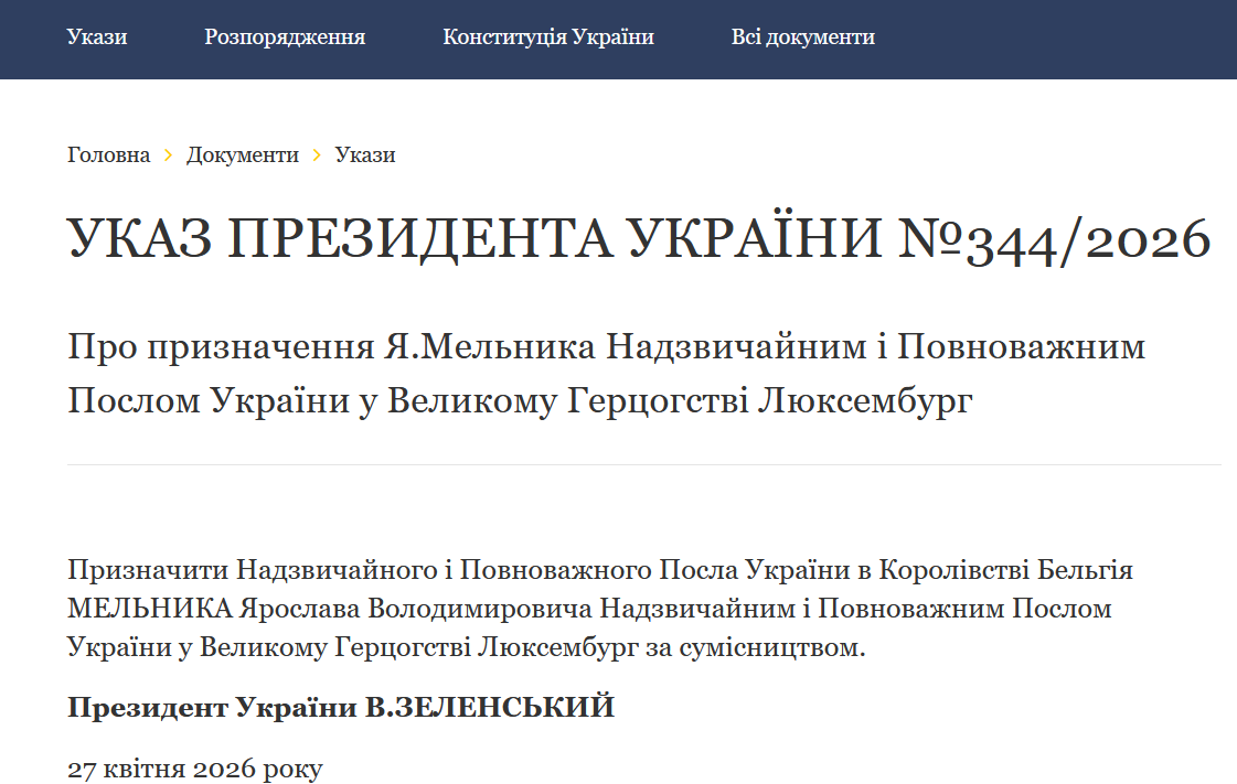 "Призначити Надзвичайного і Повноважного Посла України в Королівстві Бельгія Мельника Ярослава Володимировича Надзвичайним і Повноважним Послом України у Великому Герцогстві Люксембург за сумісництвом", — йдеться у повідомленні.