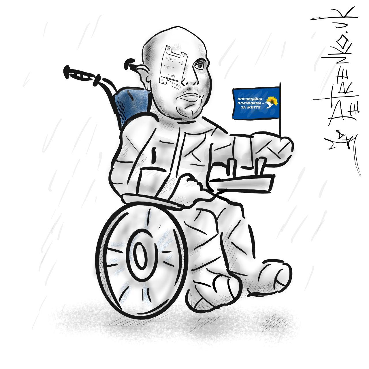 На малюнку зображено народного депутата Іллю Киву в інвалідному кріслі, в гіпсі і з підбитим оком, в руці він тримає прапорець своєї політичної партії.