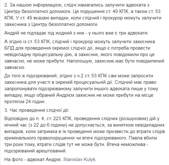 "Як адвокат може підготуватись і прибути за годину до слідчої дії? Окрім того... а як він може підготуватись за відсутності матеріалів, які йому не дають? Тобто на брифінгу сказали про певні докази, а адвокатам їх не дають", - добавил юрист.