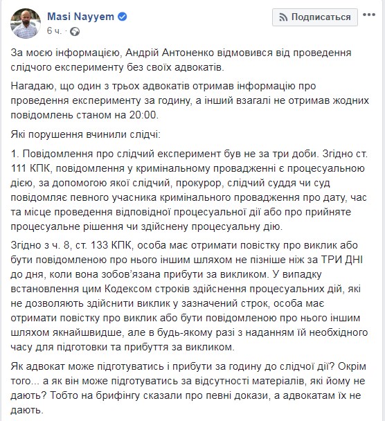 "За моєю інформацією, Андрій Антоненко відмовився від проведення слідчого експерименту без своїх адвокатів. Нагадаю, що один з трьох адвокатів отримав інформацію про проведення експерименту за годину, а інший взагалі не отримав жодних повідомлень станом на 20:00", - розповів він.