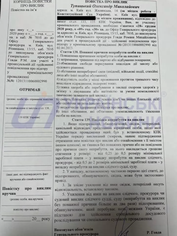 Офіс генерального прокурора викликає главу Конституційного суду Олександра Тупицького, проти якого ДБР відкрило кримінальне провадження за держзраду, для вручення підозри. Його викликають на 28 грудня.