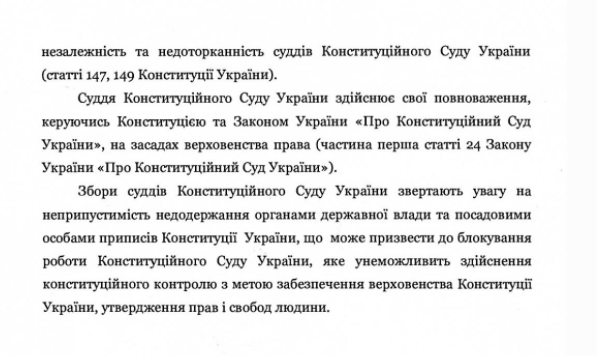 Судді КСУ звернули увагу на неприпустимості недодержання органами державної влади та посадовими особами приписів Конституції України, що може призвести до блокування роботи КСУ, яке унеможливить здійснення конституційного контролю з метою забезпечення верховенства Конституції України, утвердження прав і свобод людини.