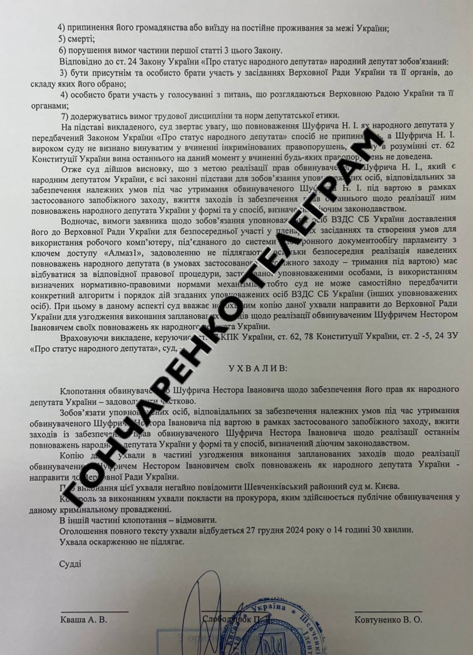 "Суд відмовив у тому, щоб Шуфрич брав участь фізично у засіданні Верховної Ради, проте зобовʼязав надати йому право виконувати депутатські повноваження в рамках його перебування в слідчому ізоляторі. Також суд направив ухвалу до Верховної Ради для консультацій.