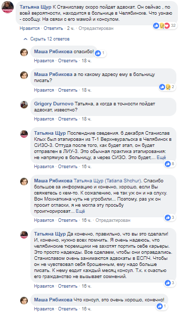 У коментарі під постом написала адвокат Тетяна Щур: "До Станіслава скоро піде адвокат. Він зараз, по всій ймовірності, знаходиться в лікарні в Челябінську. Що дізнаюся - повідомлю. На зв'язку з його мамою і консулом".