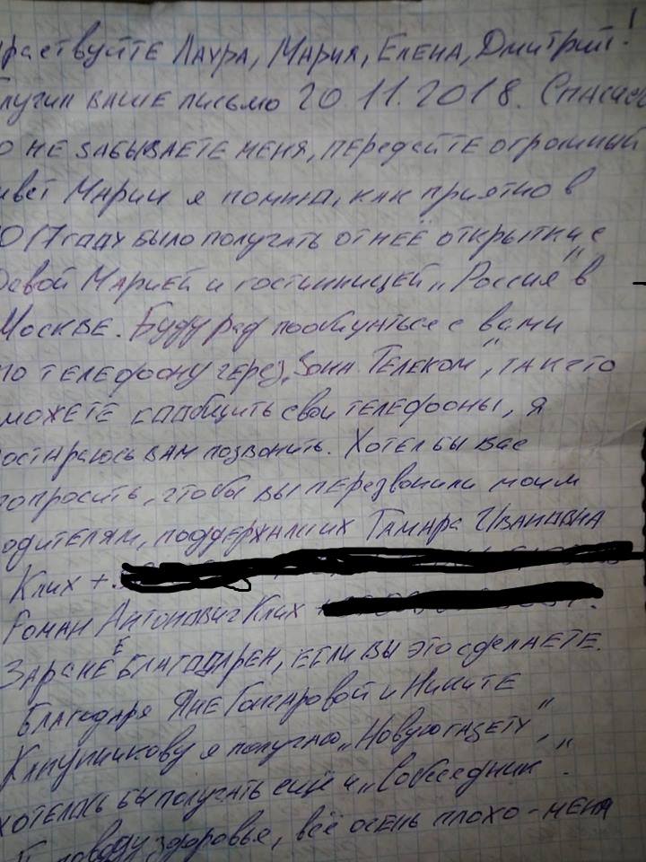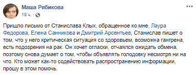 "Прийшов лист від Станіслава Клиха, звернений до мене, Лаурою Федоровою, Оленою Санніковою і Дмитром Арсентьевим, Станіслав пише про те, що у нього критична ситуація зі здоров'ям, можлива гангрена, є підозри на рак. Він хоче розголосу, зневірився чекати обміну, тому знову думає про те, щоб оголошувати голодування незважаючи ні на що. Хто може якось сприяти поширенню інформації, прошу в цьому допомогти", - йдеться в повідомленні.