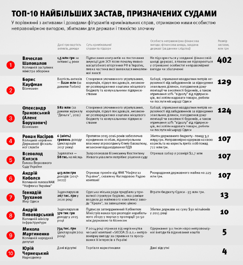 Проте колишній заступник міністра оборони Вячеслав Шаповалов за розміром застави опинився на першому місці з 402 млн грн, пояснень чому не було.