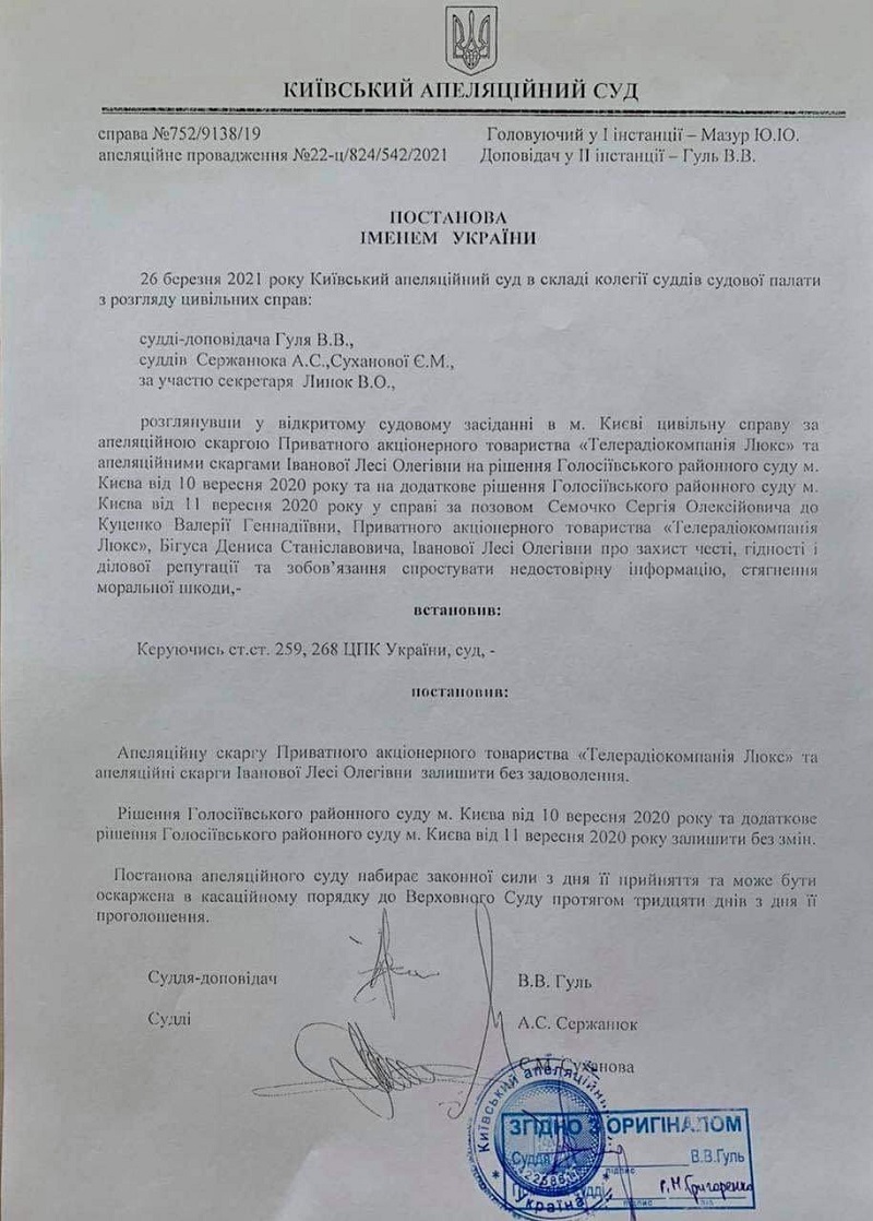 Зазначене рішення райсуду журналісти оскаржили в Апеляційному суді, пропустивши попередньо терміни оскарження. За клопотанням їхніх адвокатів вони були продовжені. У суді свої твердження про поїздки Семочка в Крим, його нібито корупційні дії та майно родичів журналісти намагалися представити як "оціночне судження". А сам сюжет про Семочко позиціонували ніби не про нього, а про СБУ в цілому. Судді з цими доводами не погодилися.