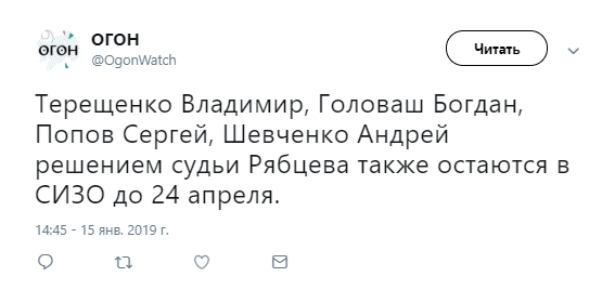 Полоненим ФСБ РФ в Керченській протоці українським морякам (Мокряку, Оприску, Семидоцькому, Цибізову, Терещенко, Головашу, Попову, Шевченку) продовжили арешт до 24 квітня.