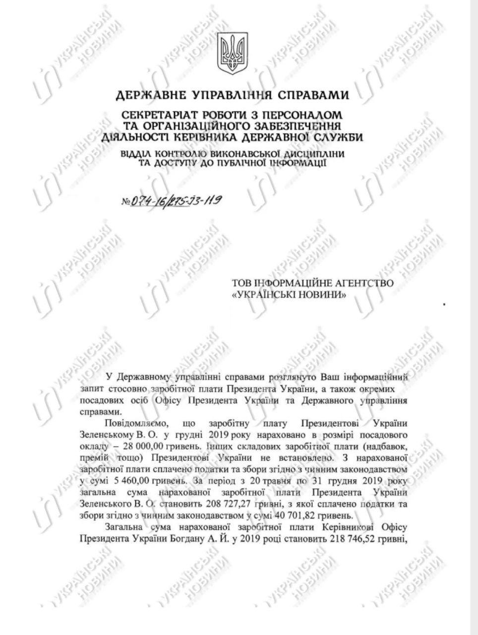 Керівник ОПУ Андрій Богдан за 2019 рік отримав 218, 7 тисяч гривень. У грудні, окрім посадового окладу у розмірі 13, 7 тисяч гривень, отримав надбавку за вислугу років у розмірі 3,7 тисяч гривень, надбавку за роботу в умовах режимних обмежень - 2,7 тисяч гривень та надбавку за інтенсивність праці - 13,7 тисяч гривень.