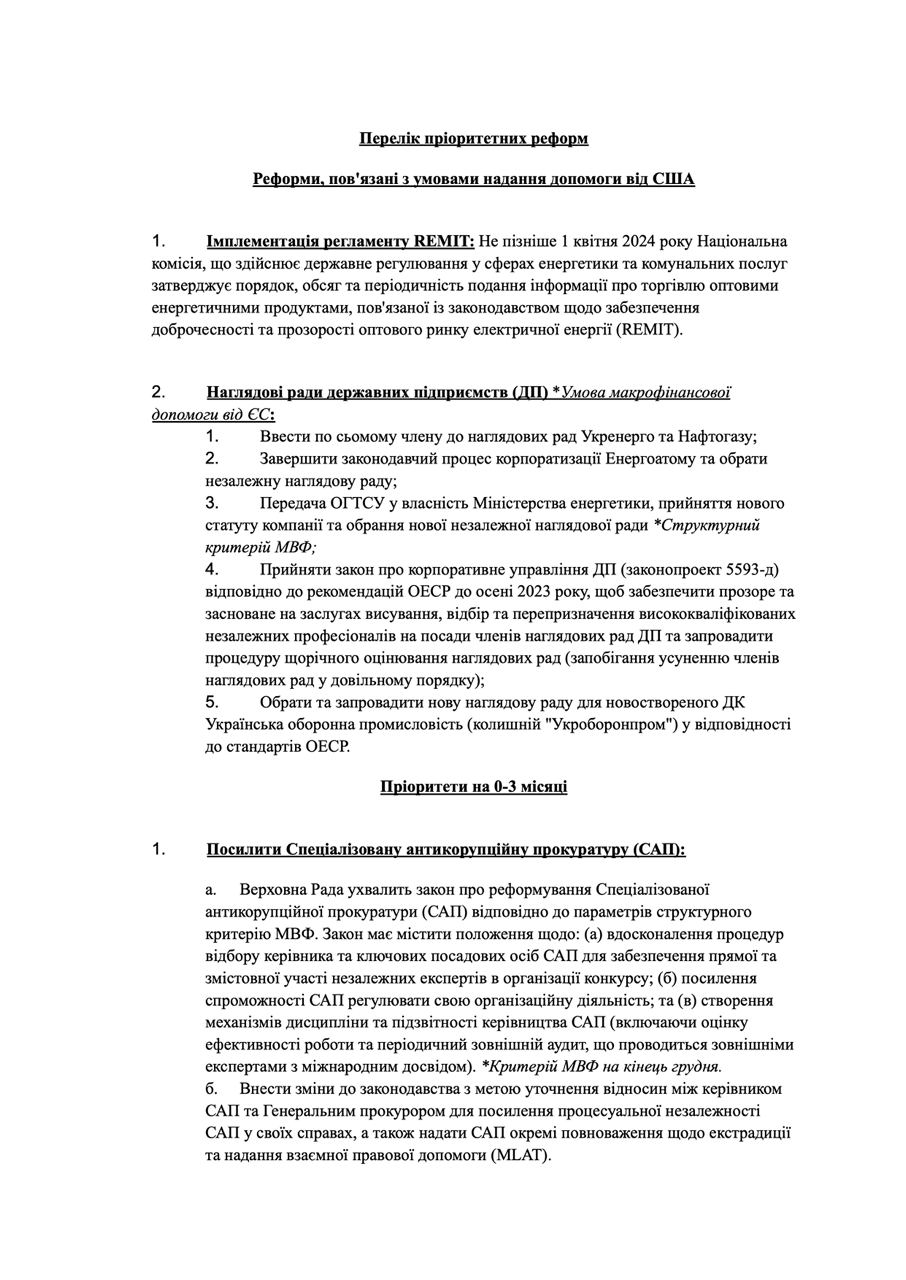 Зазначається, що Сполучені Штати відправили українській владі, а також міжнародним партнерам відповідний лист зі списком реформ.