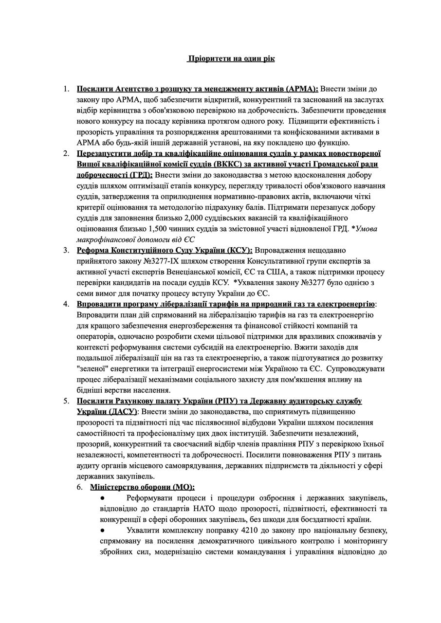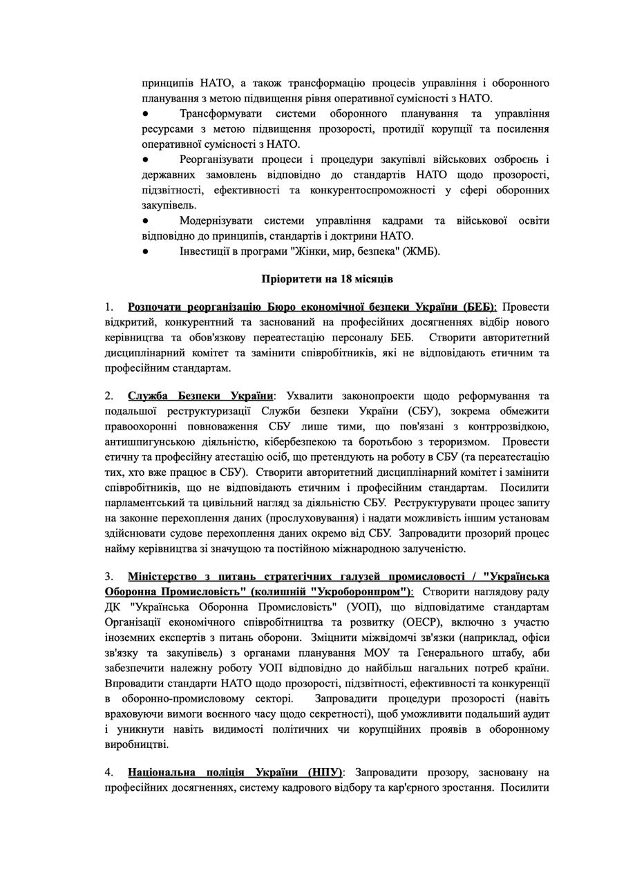У документі міститься близько двадцяти пунктів з реформами, розділені за важливістю. Пріоритети визначено: до трьох місяців, від трьох до шести місяців, від 12 до 18 місяців.