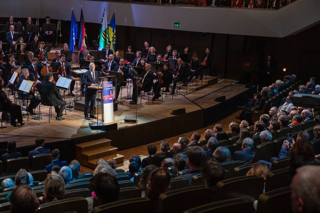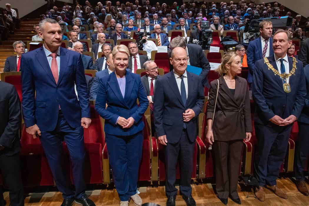Зокрема, канцлер ФРН Олаф Шольц виступив з промовою про демократію та свободу, наголосивши, що саме через прагнення українців визначати своє вільне майбутнє Росія здійснила напад на Україну.