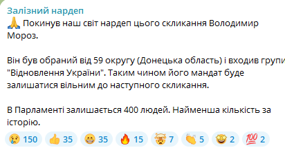 "Покинув наш світ нардеп цього скликання Володимир Мороз... В Парламенті залишається 400 людей. Найменша кількість за історію", - йдеться у дописі.