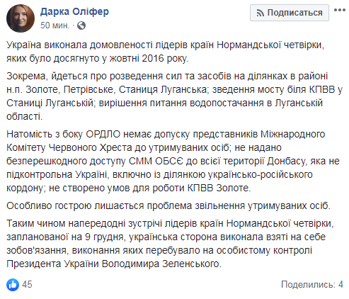 Прес-секретар Леоніда Кучми, представника України на переговорах в Мінську, Дарка Оліфер написала на своїй сторінці в Facebook, що Україна виконала домовленості лідерів країн Нормандське четвірки, які були досягнуті в жовтні 2016 року.
