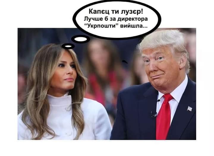 На одній з кумедних картинок Дональд Трамп зображений поруч з першою леді, при цьому Меланія Трамп міркує, що краще б вийшла заміж за директора Укрпошти, а не за цього "лузера".