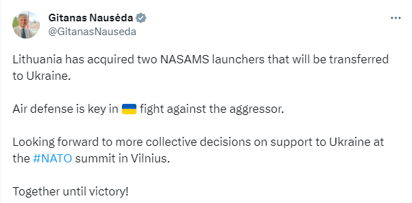 Президент Литви Гітанас Науседа у День Конституції України повідомив, що його країна придбала і передасть Україні дві пускові установки NASAMS.