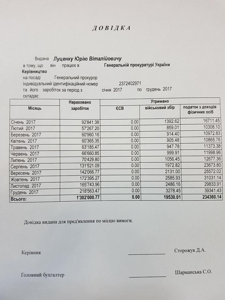 "У нас немає рахунків в офшорних зонах, ми не володіємо закордонною нерухомістю, яхтами або вертольотами. Останнім часом я отримую зарплату від 130 до 220 тисяч грн щомісяця. Іра - понад 110 тисяч доходу", - говорить Юрій Луценко, додавши, що він у грудні оплатив матеріальну допомогу пораненим воїнам АТО в сумі 450 тисяч грн.