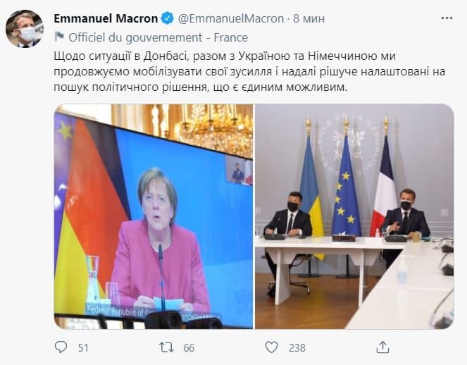 "Щодо ситуації в Донбасі, разом з Україною та Німеччиною ми продовжуємо мобілізувати свої зусилля і надалі рішуче налаштовані на пошук політичного рішення, яке є єдиним можливим", - написав Макрон.
