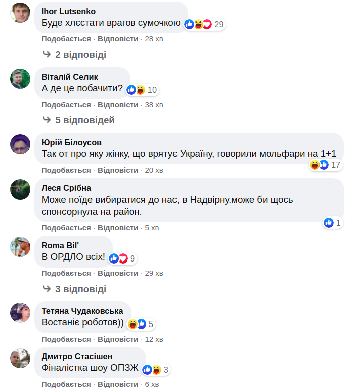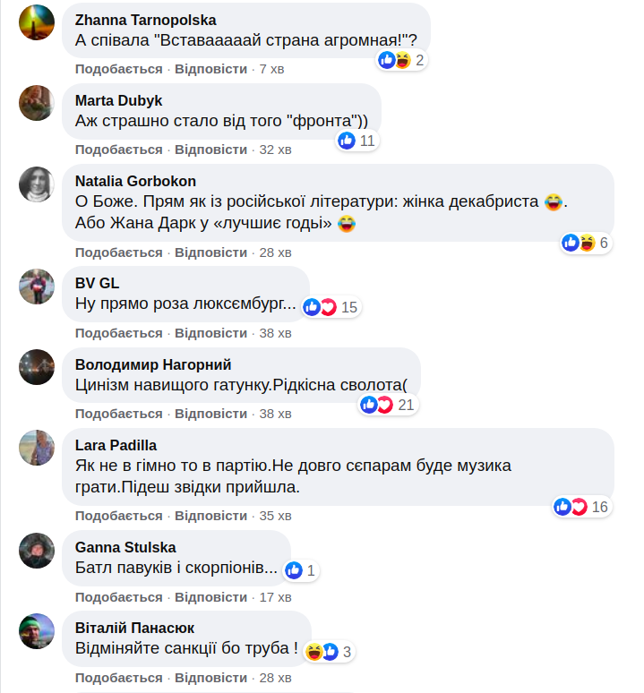 У коментарях користувачі іронічно порівнюють Оксану Марченко з дружиною декабриста, Жанною д'Арк і Розою Люксембург.