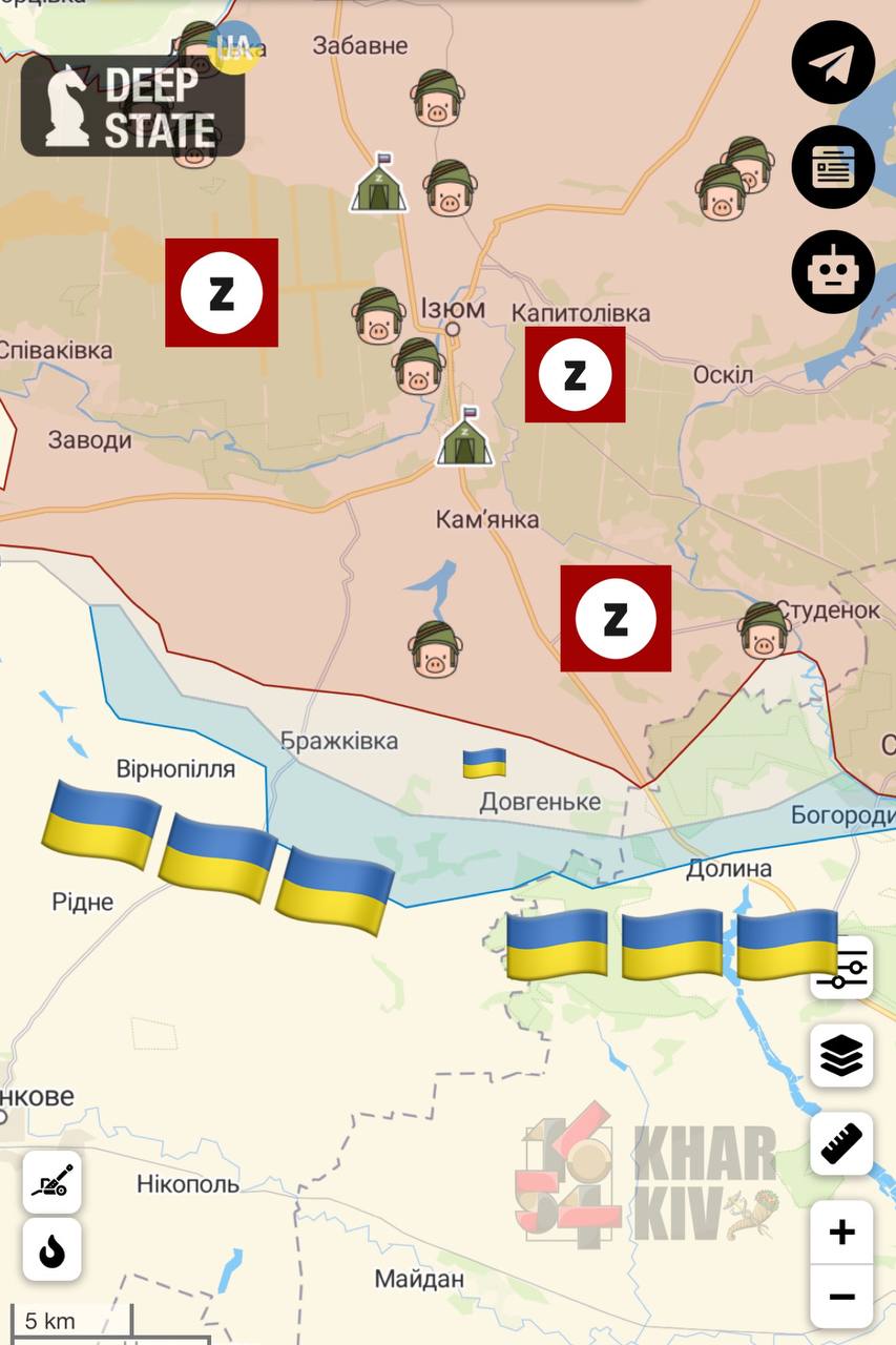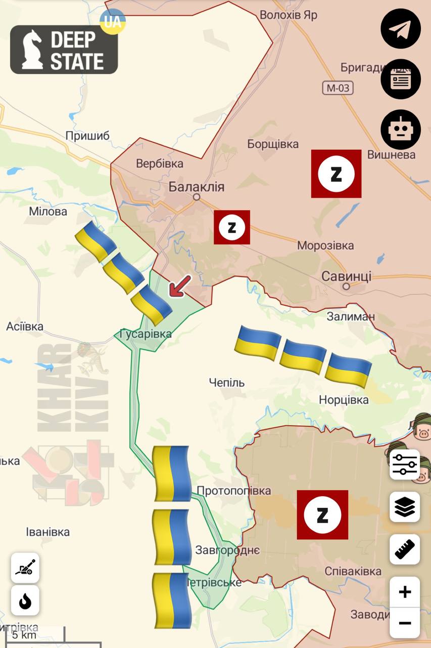 22:26 Арестович заявив, що росіяни ставлять завдання взяти Гусарівку (Харківська область, на південь від Балаклії) за будь-яку ціну, але виконати її не виходить. Також він повідомив, що Довгеньке, за деякими даними, перейшло під контроль ЗСУ. За словами Арестовича, українські війська успішно просуваються до Ізюма, і не виключено, що в оперативне оточення потраплять уже війська РФ.