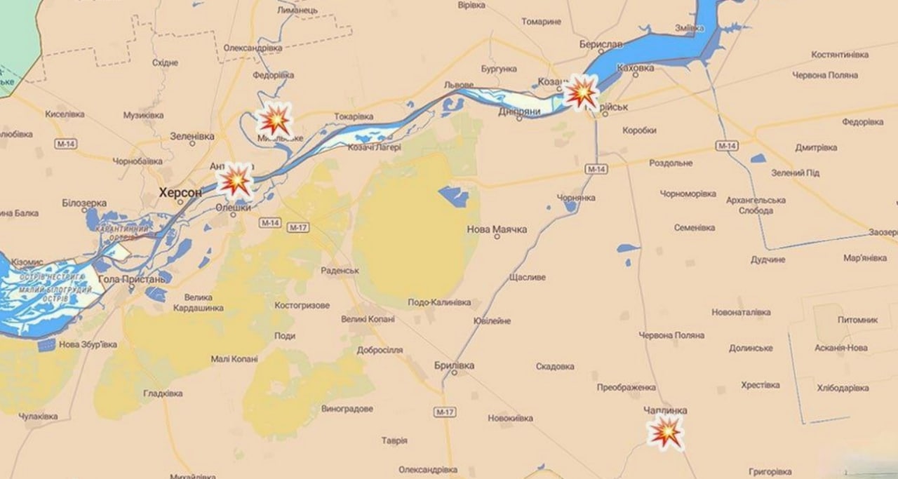 08:30 Можливі місця сьогоднішньої нічної роботи ракетних установок HIMARS. Антонівський та Дар'ївський мости, ГЕС у Новій Каховці та військовий аеродром у Чаплинці Херсонської області.