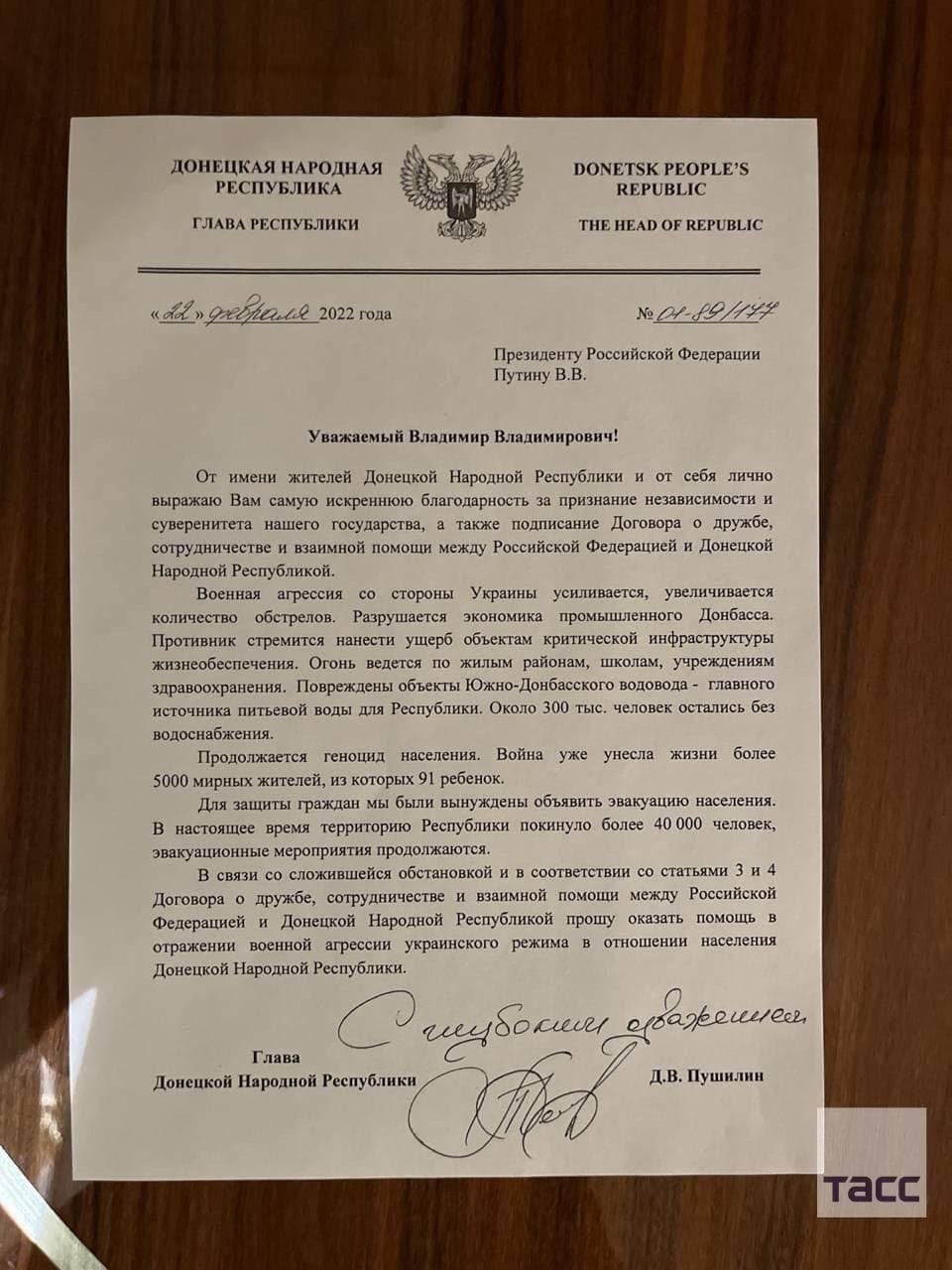 Президент Росії Володимир Путін 22 лютого заявив, що його країна визнає "кордону" т.зв. "Л/ДНР", йдеться про адмінкордони Донецької та Луганської областей України. Після цього Рада федерацій схвалила пропозицію глави РФ щодо використання військ на окупованій частині Донбасу. Також були звернення президента США Джо Байдена і президента України Володимира Зеленського, які жорстко розкритикували дії РФ.