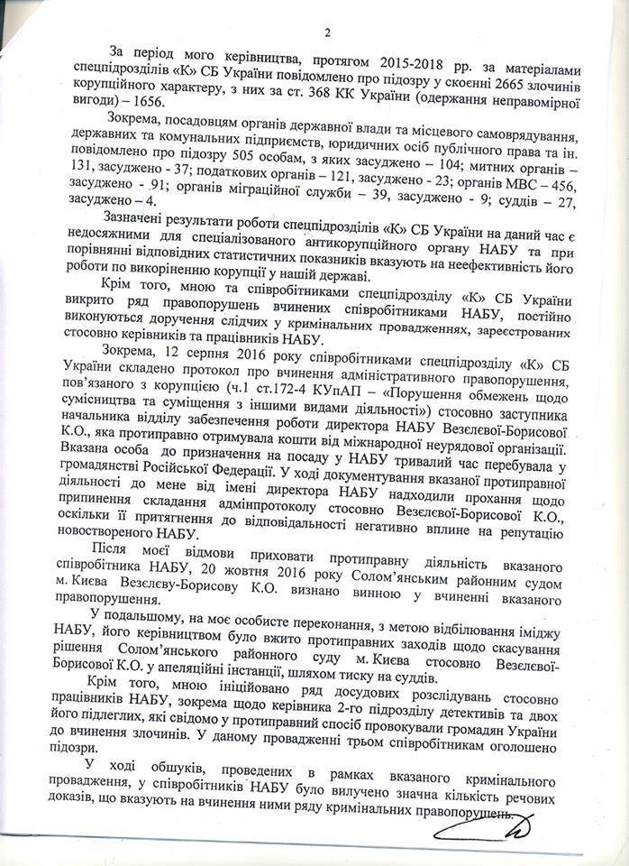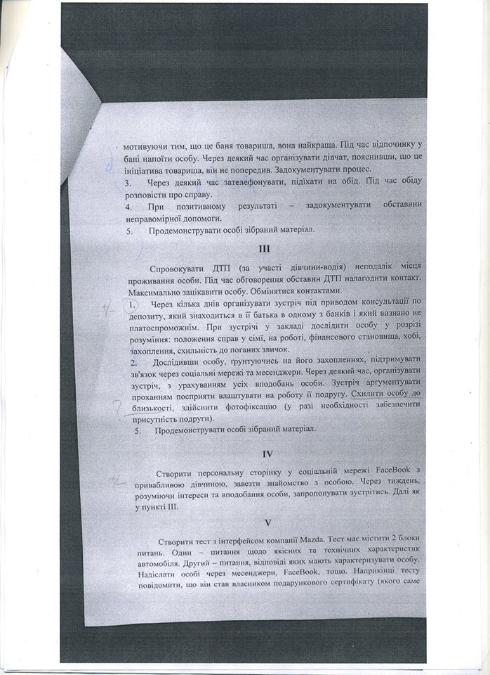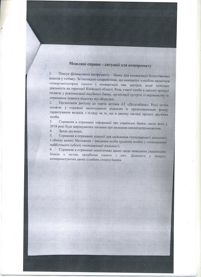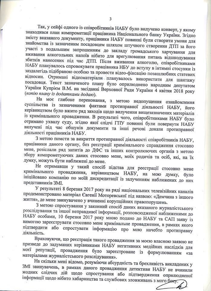 "У сейфі одного із співробітників НАБУ було вилучено конверт, в якому знаходився план компрометації співробітника НБУ. Згідно з ним, представники НАБУ повинні були створити умови для знайомства з зазначеною посадовою особою шляхом штучного створення ДТП за його участі та подальшим запрошенням до закладу громадського харчування для вживання алкогольних напоїв нібито для врегулювання питань відшкодування шкоди, завданої під час ДТП", - йдеться в заяві Демчини.