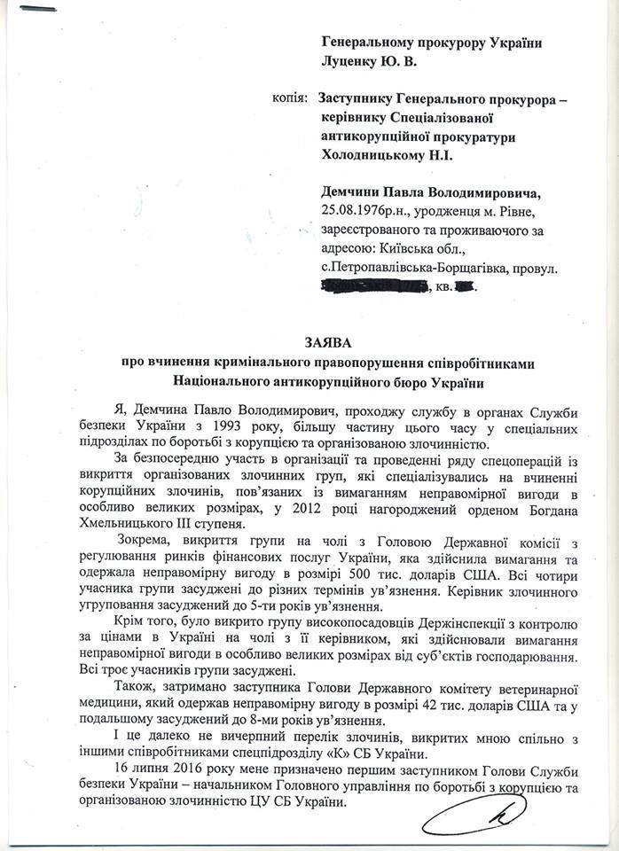 Як повідомлялося, раніше Демчина розповів про те, що НАБУ підготувало йому необгрунтоване підозра про незаконне збагачення. У зв'язку з цим він подав скаргу Генеральному прокурору.