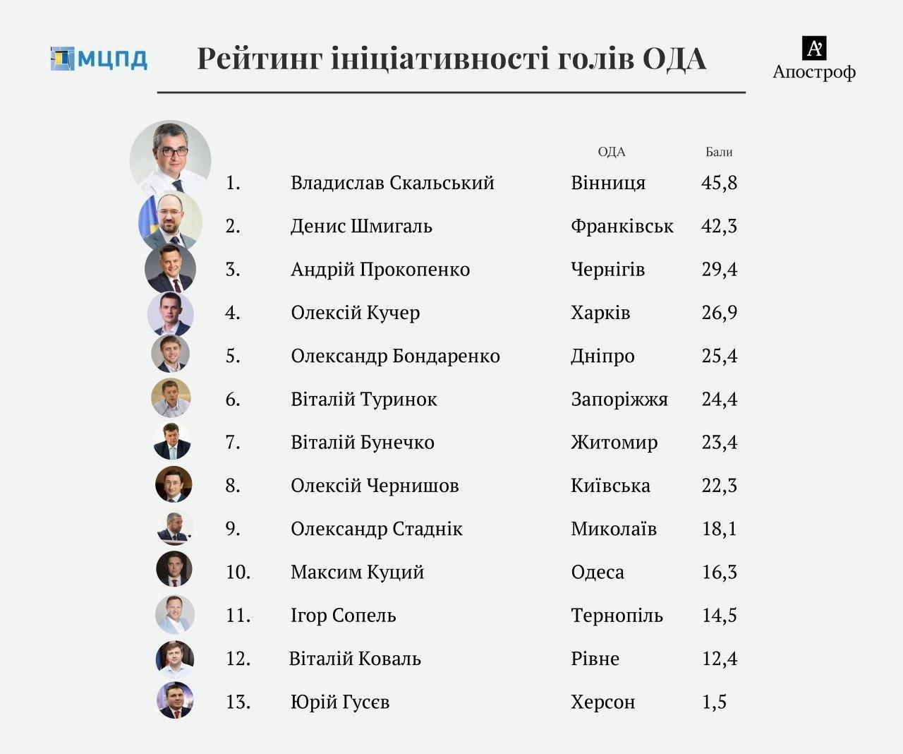 Міжнародний центр перспективних досліджень (МЦПД) у партнерстві з інтернет-виданням "Апостроф" підготували "Рейтинг ініціативності голів ОДА"