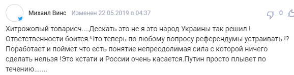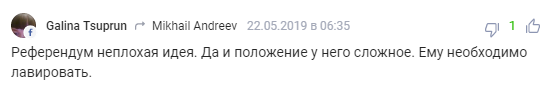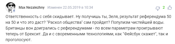 "Відповідальність за себе скидає. Ну отримаєш ти, Зеля, результат референдуму 50 на 50 і що це дасть? "Розкол суспільства" сам пройде? Популізм найчистішої води. Британці геть догралися з референдумами - за всіма параметрами програють тепер від Брексил. Та й з Своременного технологіями, як "Фейсбук скаже", так і проголосують", - пишуть ті, які не бачать сенсу в референдумі.