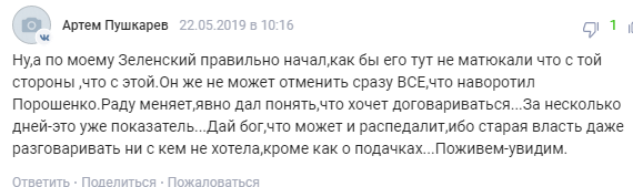 "Ну, а по моєму, Зеленський правильно почав, як би його тут не матюкаюся що з того боку, що з цієї. Він же не може скасувати відразу ВСЕ, що навернув Порошенко. Раду змінює, явно дав зрозуміти, що хоче домовлятися... За кілька днів - це вже показник... Дай бог, що може і розпедалить, бо стара влада навіть розмовляти ні з ким не хотіла, крім як про подачки... Поживемо-побачимо", - пишуть коментатори.