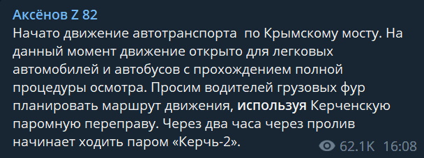 17:11 Очільник окупаційної "адміністрації" Криму Сергій Аксьонов заявив про відновлення руху через міст для легкових автомобілів та автобусів.