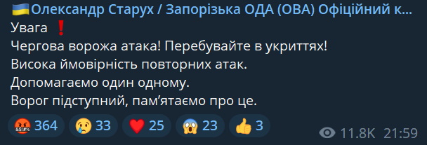 22:05 Окупанти знову обстріляли Запоріжжя, є висока ймовірність нових атак - голова ОДА Старух.