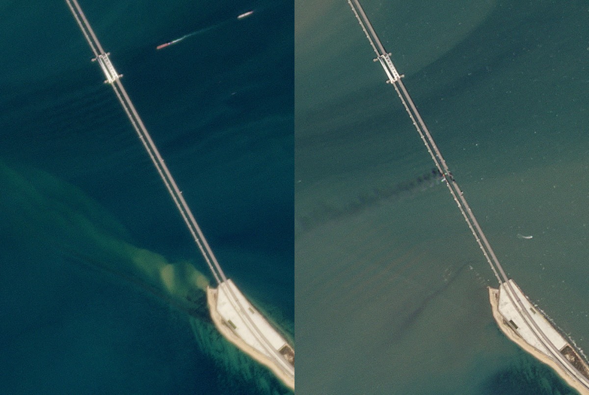 21:39 Компанія Planet опублікувала знімки супутникового Кримського мосту до і після вибуху. Кадри були зроблені в період із 7 по 8 жовтня.