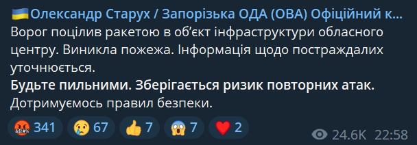 23:24 У Запоріжжі окупанти потрапили в об'єкт інфраструктури, виникла пожежа. Інформація щодо постраждалих уточнюється – голова ОДА Олександр Старух.