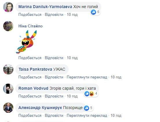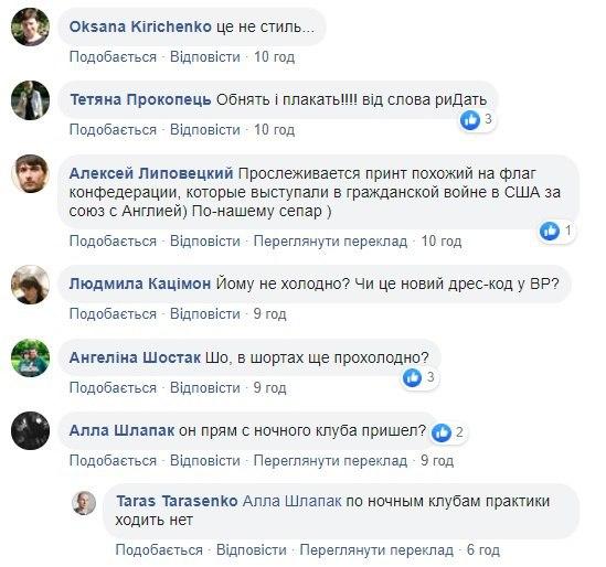 "Обійняти і плакати! Від слова ридати", "Простежується принт схожий на прапор конфедерації, які виступали в громадянській війні в США за союз з Англією. По-нашому сепар", "Він прям з нічного клубу прийшов?", "Хоч не голий","Позорище ", - пишуть коментатори.