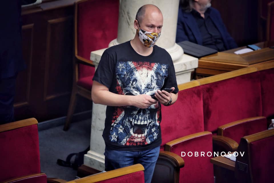 Тарасенко прийшов в Раду в джинсах і футболці з черепом, також на ньому була маска з принтом.