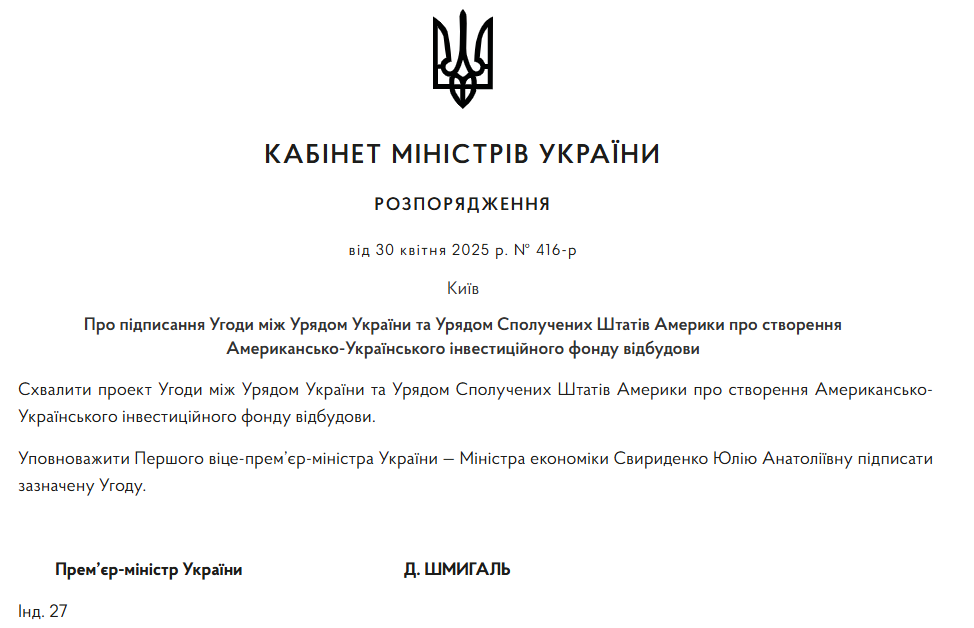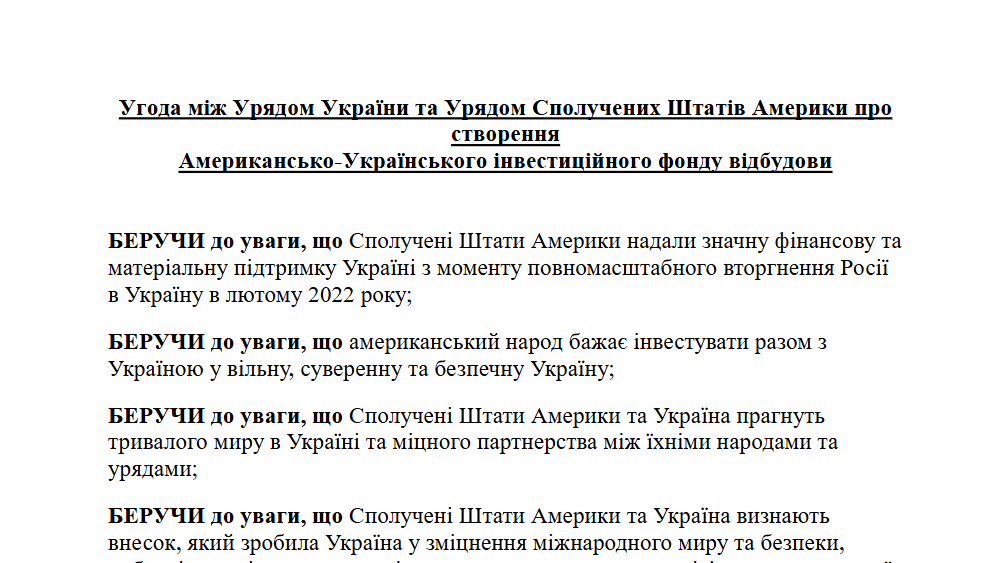 Кабінет міністрів України оприлюднив текст угоди про створення Інвестиційного фонду відбудови, підписаної Україною та Сполученими Штатами Америки.