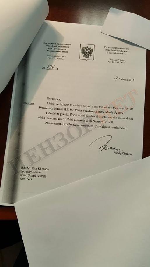 Журналісти відзначають, що достовірність цього документу запевнив своїм листом постійний представник РФ в ООН Віталій Чуркін. Саме даний лист Чуркін демонстрував на засіданні Ради Безпеки ООН 3 березня 2014 року.
