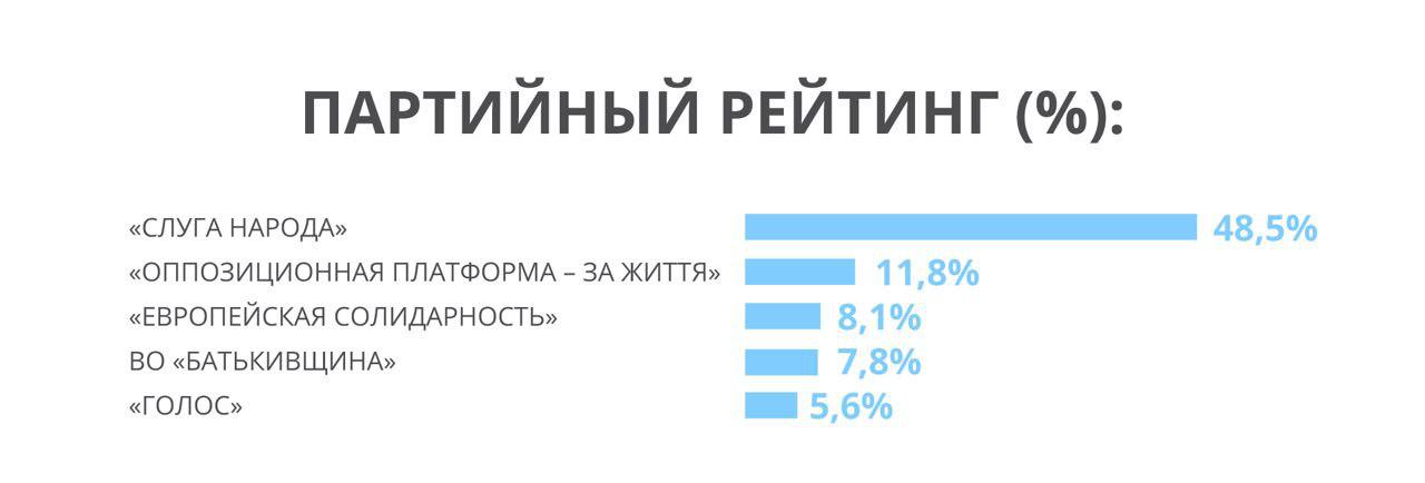 Також прохідний бар'єр на парламентських виборах долають "Європейська солідарність" Петра Порошенко (8,1%), ВО "Батьківщина" Юлії Тимошенко (7,8%) і "Голос" Святослава Вакарчука (5,6%). З огляду на статистичну похибку, залишаються шанси пройти в Раду і у партії "Сила і честь" Ігоря Смешка (3,8%).