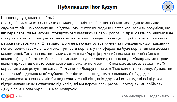Посол України з особливих доручень МЗС у Білорусі Ігор Кизим залишив дипломатичну службу.
