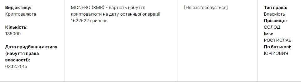 Солод вказав, що володіє 185 тисячами монет Monero. Зараз дана одиниця криптовалюти торгується в районі 133 доларів. Таким чином, криптовалютні активи депутата в грошовому вираженні складають 24,5 мільйона доларів (688,2 мільйона гривень).