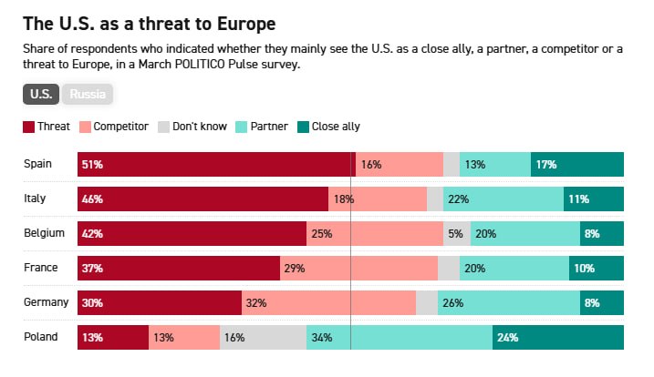 Зокрема, найнегативнішу оцінку Сполученим Штатам дали іспанці: 51% назвали їх загрозою, 16% — конкурентом, 13% — союзником, 17% — близьким партнером. При цьому фактично одноголосно виступили за посилення автономності Європи: 94% заявили, що континенту потрібно стати більш самодостатнім і вийти із залежності від інших великих країн, навіть якщо такий перехід спричинить суттєві економічні витрати.