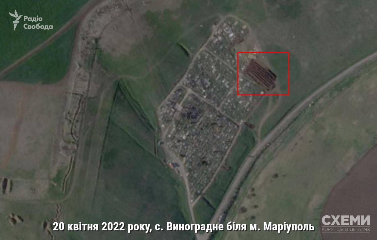 20:20 За 5-6 кілометрів від Маріуполя, поруч з селом Виноградне, супутник зафіксував ще одну братську могилу, розміри поховання становлять 45 на 25 метрів.