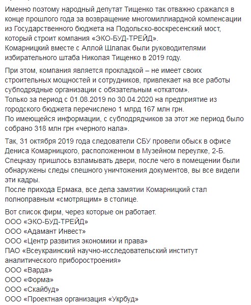 "Денис Комарницький "працює" в столиці не тільки через комунальні підприємства. У 2016 році компанія "Екобудтрейд", у якій кінцевими бенефіціарами є Комарницький, Кучер і Микитась, через підставну особу виграла тендер на будівництво частини Подільсько-Воскресенського моста. До управління цим підприємством мають відношення сестра нардепа Тищенко Юлія і її чоловік Герман Блінов", - написав Лерос.