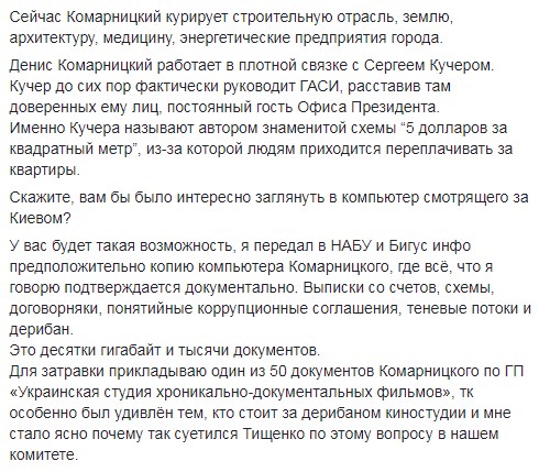 Він нагадав, що колишній депутат Київради Комарницький, перебуваючи на посаді голови наглядової ради Київміськбуду, став великим акціонером цієї компанії, переоформивши пакет акцій на себе.
